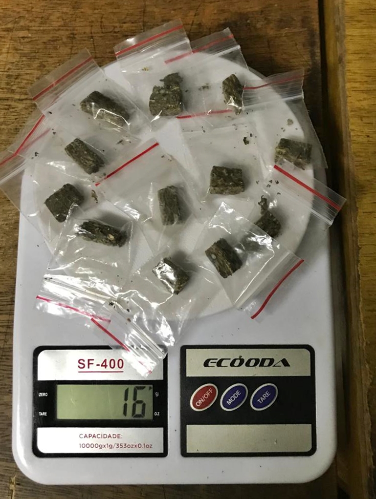 A abordagem ocorreu metros depois. Com ele, nada de ilícito foi encontrado; entretanto, no local onde ele estava, foram encontradas doze porções de maconha embaladas e prontas para a venda.