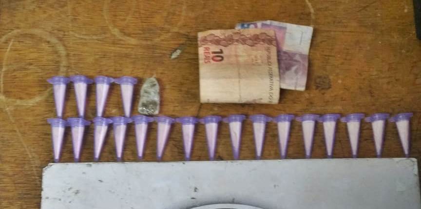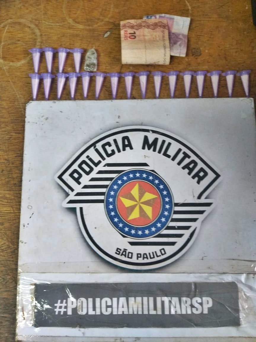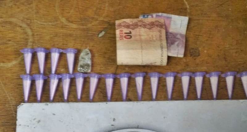 O adolescente se desfez de um pote plástico durante a tentativa de fuga que continha vinte microtubos de cocaína e uma porção de maconha em seu interior. Em revista pessoal, foi encontrada a quantia de R$ 15.
