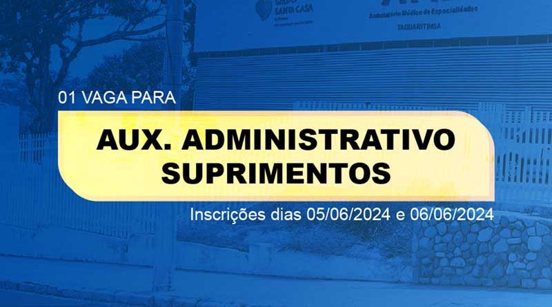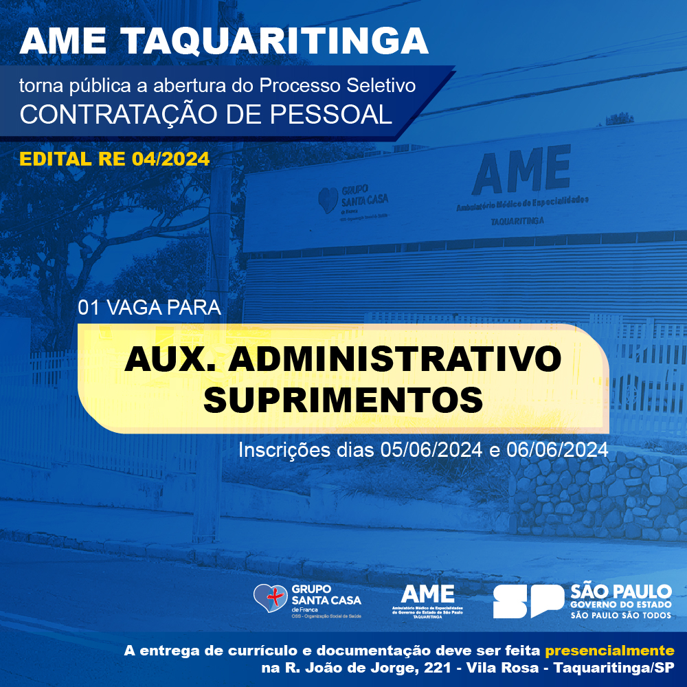 O Ambulatório Médico de Especialidades (AME) de Taquaritinga abriu vaga para Auxiliar de Suprimentos. Esse edital está com a inscrição aberta até a quinta-feira (6). Toda documentação deve ser entregue até esse prazo na secretaria do AME presencialmente, pela Avenida João de Jorge, nº 221, na Vila Rosa. O edital com toda a documentação exigida está disponível no site da Fundação Santa Casa de Misericórdia de Franca, que é responsável pelo ambulatório de Taquaritinga.