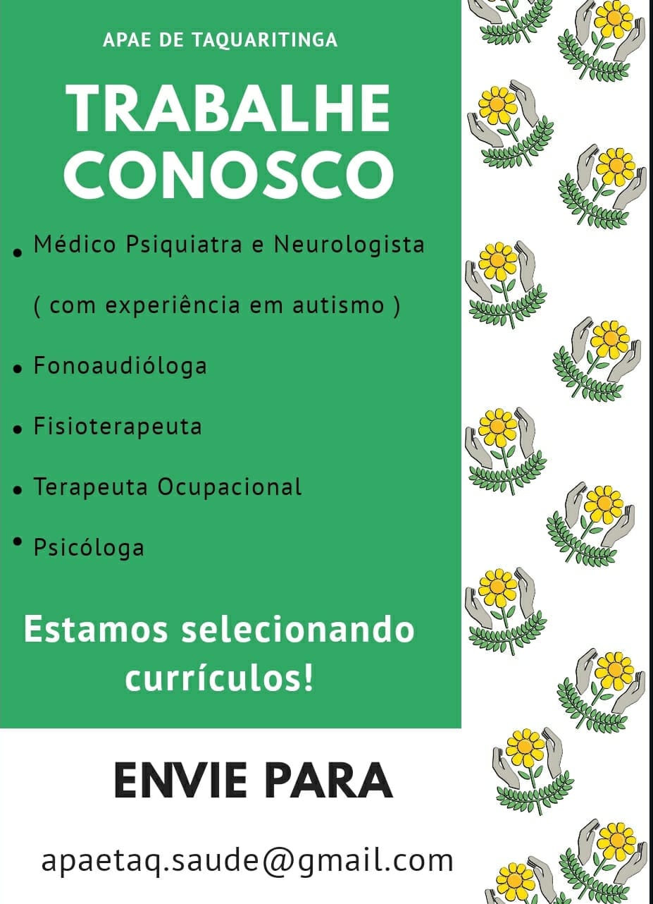 A Associação de Pais e Amigos dos Excepcionais (APAE) de Taquaritinga/SP está recebendo currículo para atualização do banco de contatos de profissionais da Saúde interessados em trabalhar na entidade quando houver abertura de vagas.