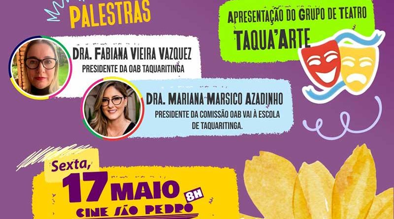 A programação conta com apresentação do grupo de teatro Taqua’Arte e palestras com a Dra. Fabiana Vieira Vazquez, Presidente da OAB Taquaritinga, e a Dra. Mariana Mársico Azadinho, Presidente da Comissão OAB Vai à Escola de Taquaritinga.