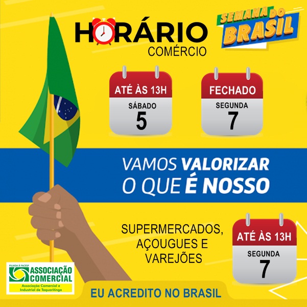 A Associação Comercial e Industrial de Taquaritinga (ACIT) informa que o comércio da cidade ficará fechado amanhã, dia 7 de Setembro, feriado nacional da Independência do Brasil.