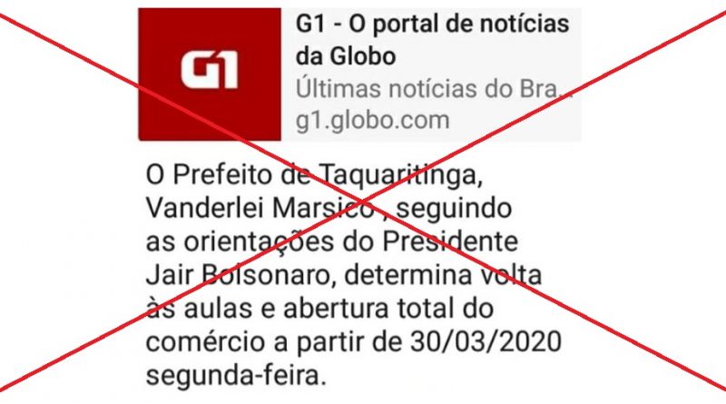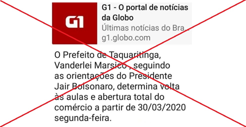 Desde sexta-feira (27), os moradores de Taquaritinga (SP) estão se deparando com a imagem de uma reportagem, supostamente feita pelo ‘Portal de Notícias Online G1’, que traz a informação da reabertura dos estabelecimentos comerciais e retorno das aulas na próxima segunda-feira (30). Tal notícia ainda afirma que a decisão foi tomada prefeito Vanderlei José Mársico, causando discussões nas redes sociais e em grupos de Whatsapp.