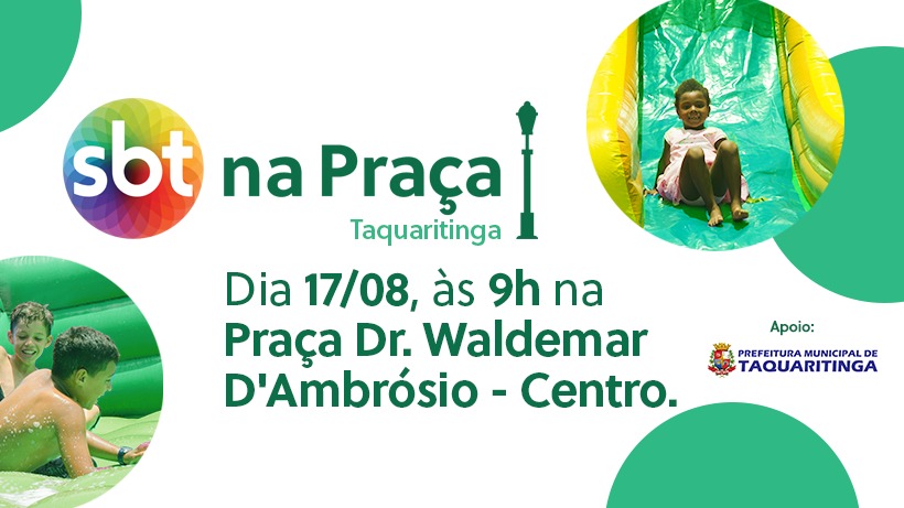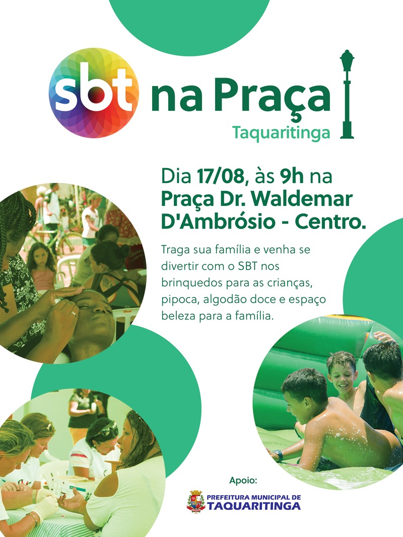 Pela primeira vez, a cidade de Taquaritinga (SP) receberá o evento recreativo “SBT Na Praça”, organizado e custeado pela equipe do Sistema Brasileiro de Televisão (SBT) em parceria com a Prefeitura Municipal do município. As atividades estão marcadas para aconteceram no dia 17 de Agosto (sábado), na Praça Waldemar D’Ambrósio, no centro da cidade, das 9h até as 13h.