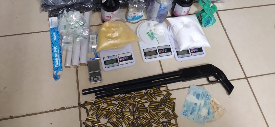 Uma testemunha acompanhou a vistoria no imóvel. A PM encontrou R$ 600 em dinheiro, um aparelho celular e uma réplica de espingarda (calibre 12) dentro de um guarda-roupa. No sótão, foram localizados um quilo de cocaína, cento e setenta e duas munições de revólver calibre 38, quatro balanças de precisão, vinte e três mil pinos vazios (para armazenar cocaína), cento e trinta e uma embalagens plásticas, quatro rolos de plástico-filme, dois frascos de acetona, uma lata de substância ‘Éter’ e uma lata de solvente para tintas e vernizes (Thinner).