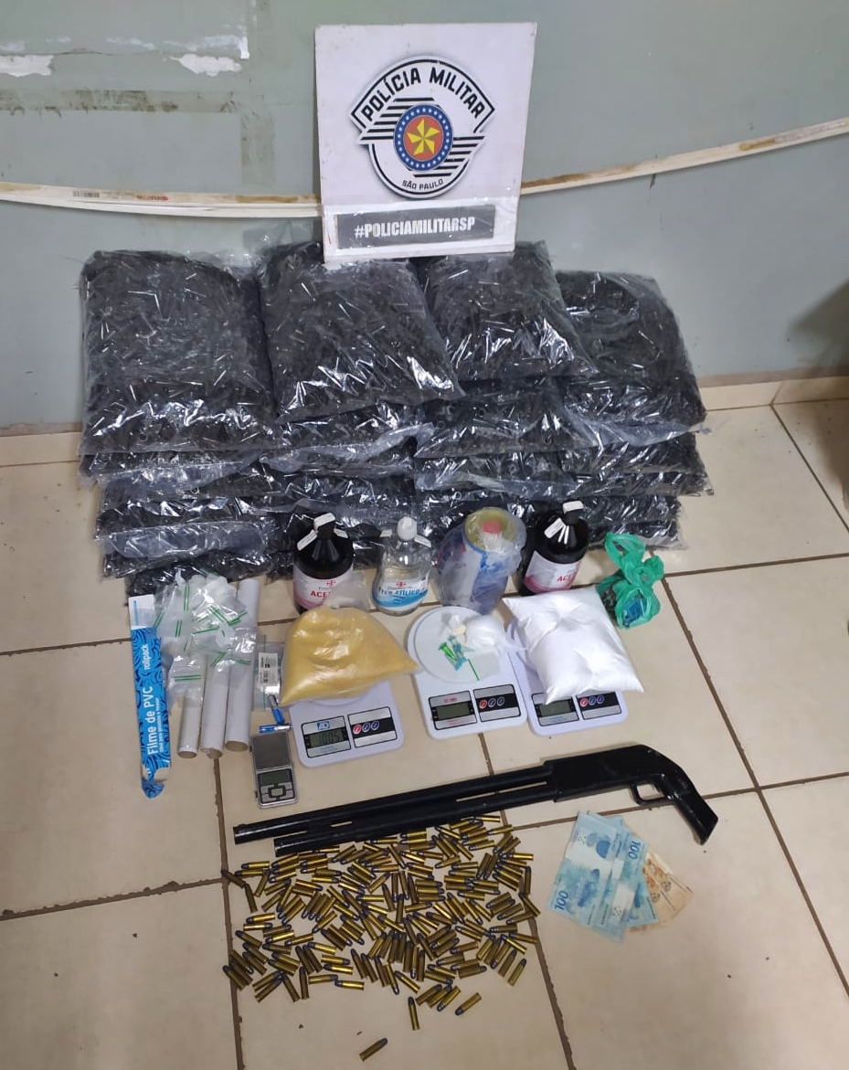 A Força Tática de Taquaritinga (SP) deu um grande prejuízo para o tráfico de drogas na tarde de sábado (22) depois de apreender diversos entorpecentes e uma arma de fogo com munições em uma residência do Jardim do Bosque. Ninguém foi detido.