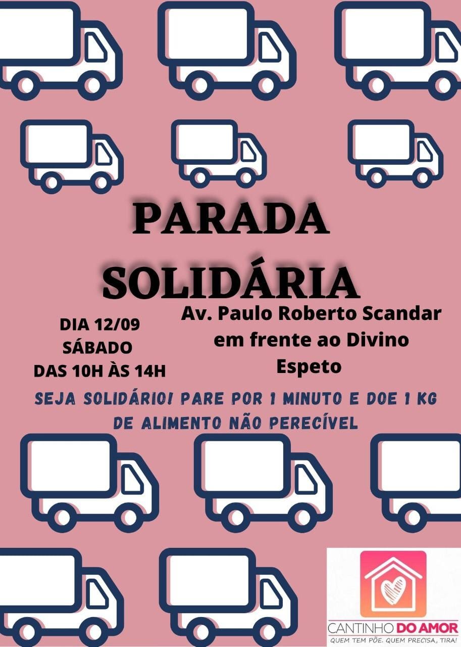 A ação, denominada ‘Parada Solidária’, acontecerá na Avenida Paulo Roberto Scandar, próximo à Praça Tóquio, das 10h ás 14h. Para ajudar, basta passar pelo trecho e deixar a oferta com um dos voluntários; não será necessário o desembarque do carro.