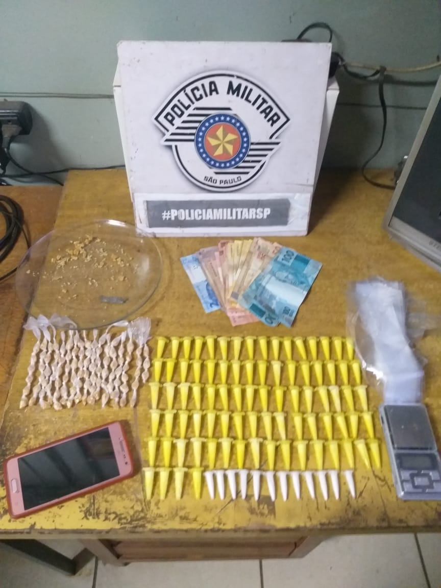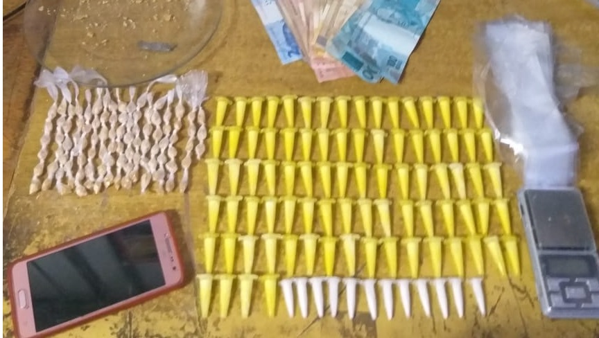 Foram localizados quase cem microtubos de cocaína, pedras de crack, objetos para embalar entorpecentes e uma quantia em dinheiro.