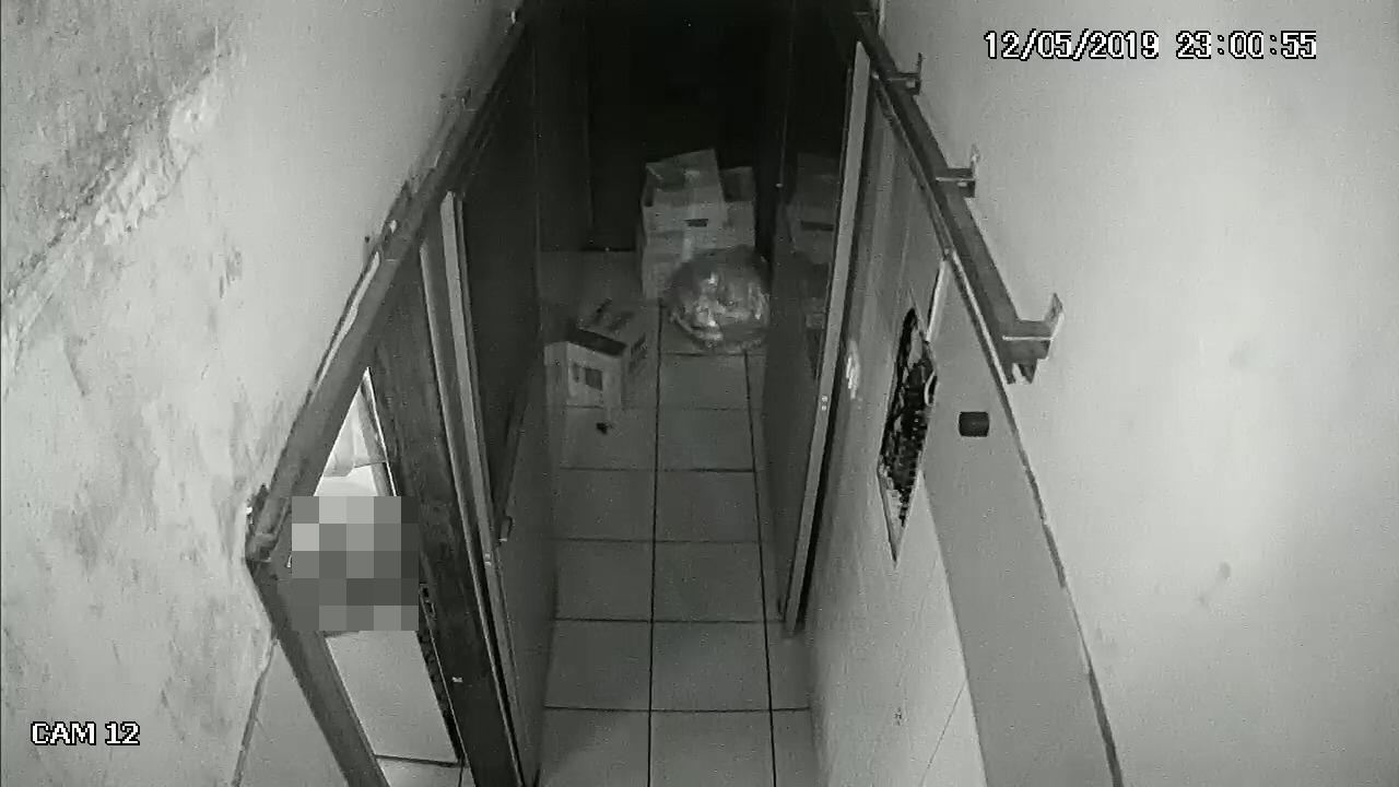 Conforme consta nas imagens, um dos autores do furto aparece no interior do supermercado ás 23h. Ele consegui invadir o local através do arrombamento do vidro da cozinha.