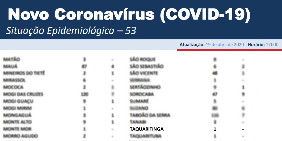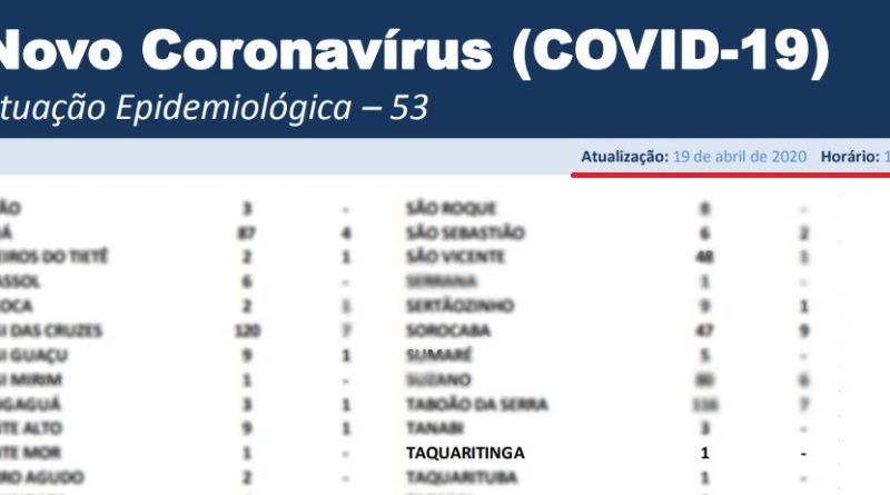 O boletim epidemiológico número 53, atualizado e divulgado pela Secretaria Estadual de Saúde na noite de domingo (19) no site da Prefeitura de São Paulo, apontou um paciente testado positivo para Covid-19 em Taquaritinga (SP). A informação se disseminou rapidamente nas redes sociais, gerando preocupação nos moradores.