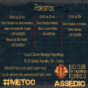 Na próxima semana, o LEO Clube de Taquaritinga (SP) promoverá um ciclo de palestras com o tema “Assédio”. O encontro será realizado no auditório da Câmara Municipal da cidade e a entrada é gratuita.