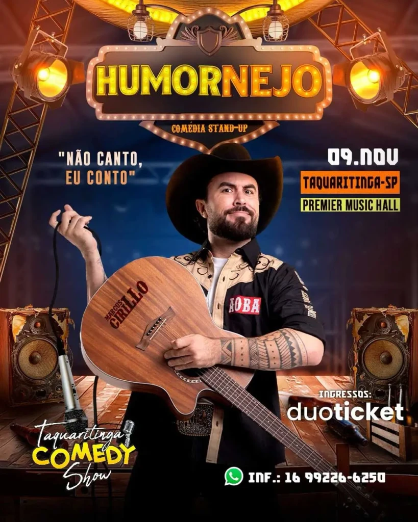 Depois de um ano, o humorista Marcus Cirillo está de volta a Taquaritinga com seu novo espetáculo “Humornejo”. O show acontece no próximo domingo, dia 9, a partir das 20h, no Premier Music Hall e faz parte de mais uma edição do Taquaritinga Comedy Show, evento que vem consolidando no humor da região.