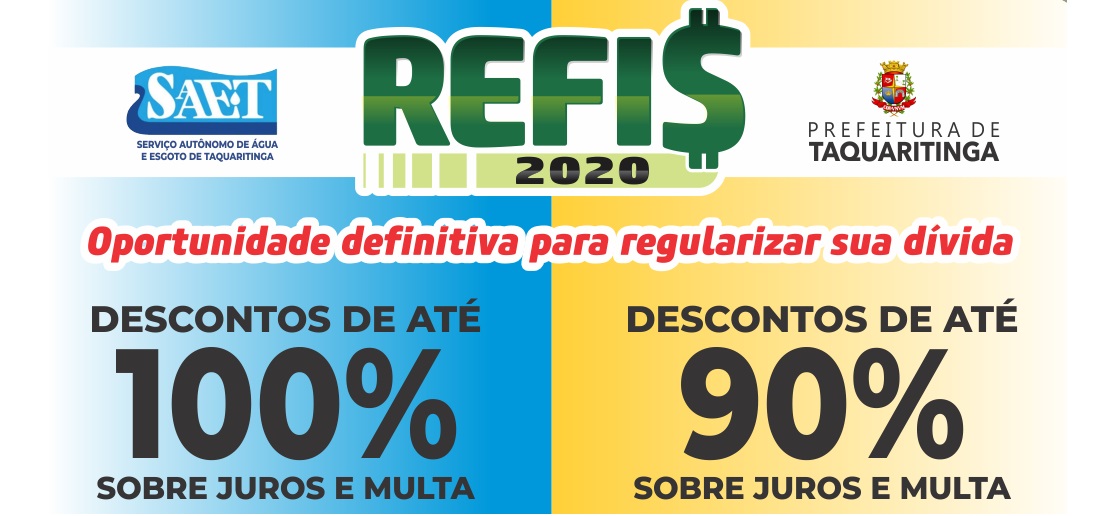 O Refis do SAAET (Serviço Autônomo de Água e Esgoto) é voltado a contribuintes que estejam com contas atrasadas até 30 de novembro deste ano. Essas pessoas poderão procurar a autarquia para renegociar os débitos. O prazo para aderir ao Refis é de 90 dias.