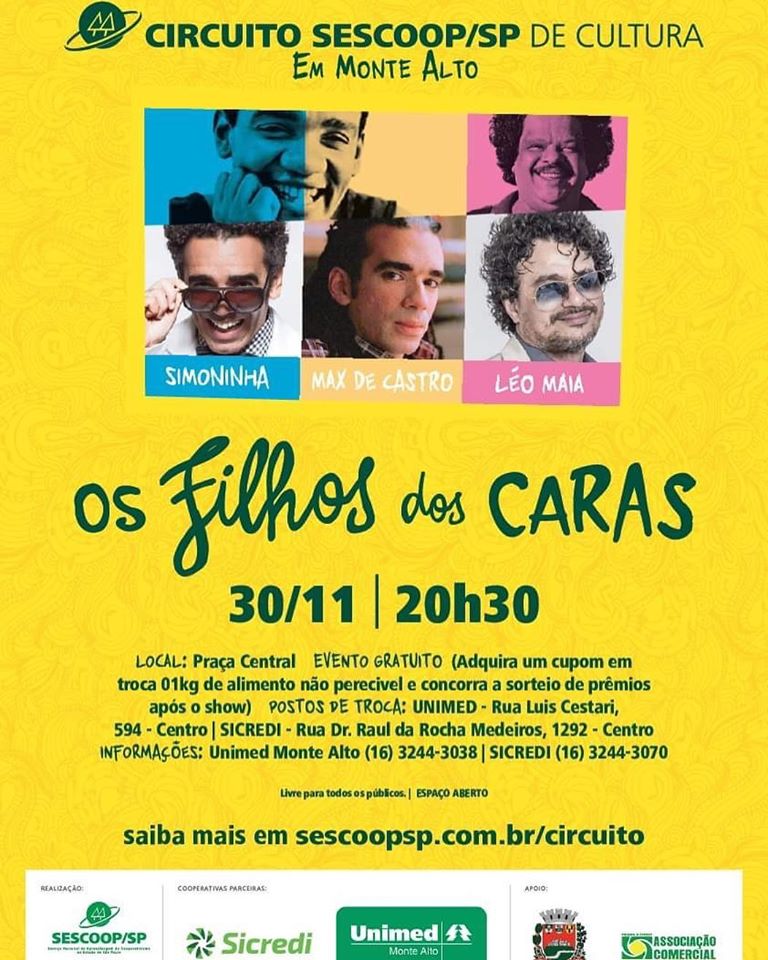 Wilson Simonal, Tim Maia e Djavan vão ser homenageados por Simoninha, Max de Castro e Léo Maia no show “Os Filhos dos Caras”, em um evento gratuito em Monte Alto (SP) no próximo dia 30 de Novembro, na Praça Central, a partir das 20h30. A ação faz parte do Circuito Sescoop/SP de Cultura, promovido em parceria com o banco Sicredi e o plano de saúde Unimed da cidade.