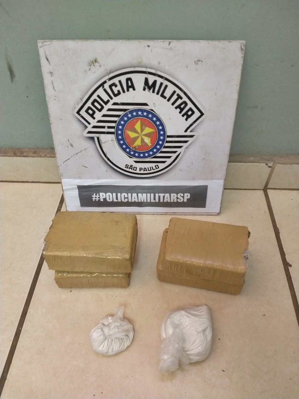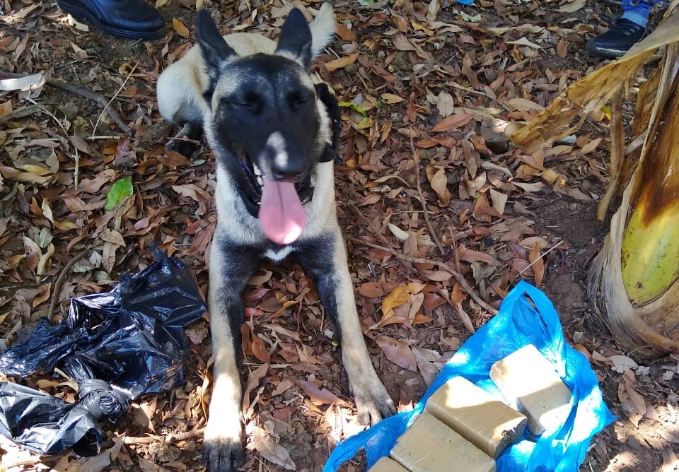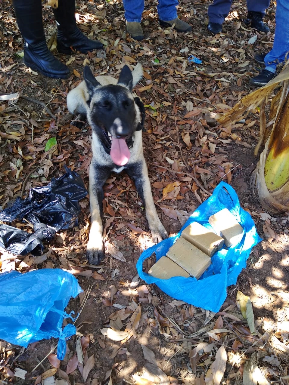 Durante a operação, os cachorros encontraram quatro porções de maconha (dividas em tabletes) e dois pequenos sacos plásticos contendo cocaína e que estavam enterrados em um ponto da propriedade rural ao lado de uma bananeira.