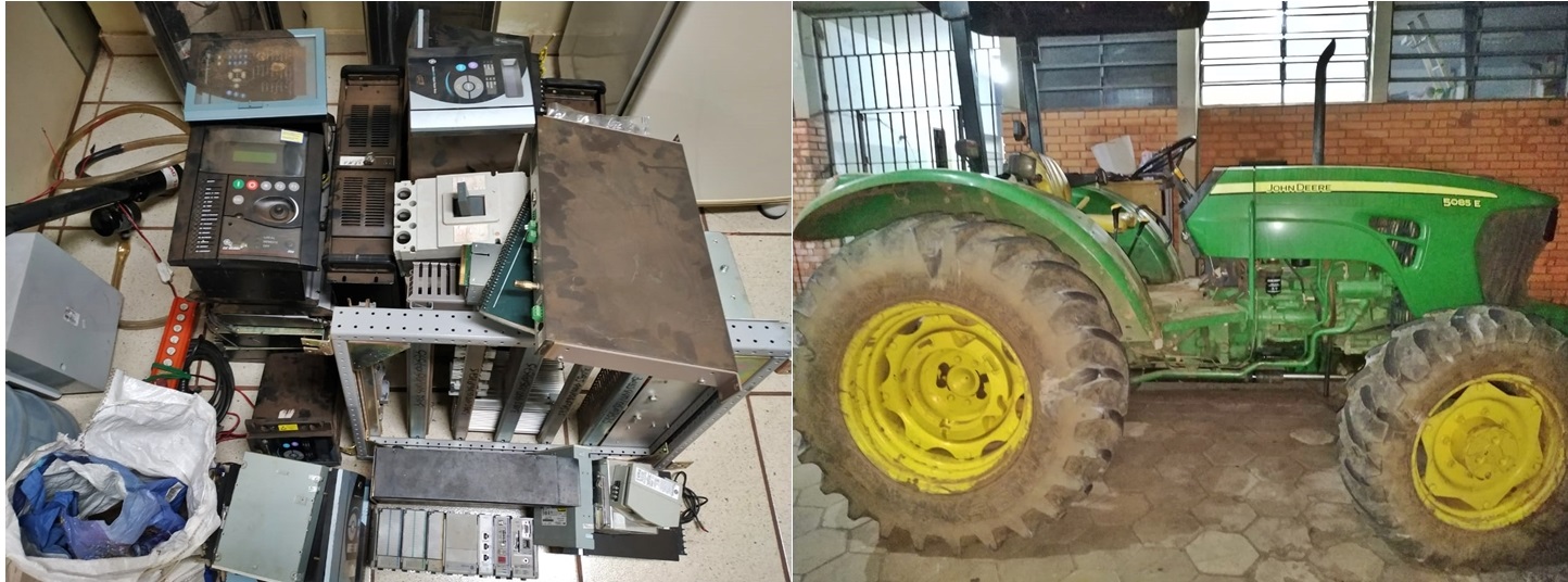 Diante da denúncia, a equipe recebeu o reforço do Cabo PM Edson, Cabo PM Júnior e dos integrantes da Força Tática e todos se dirigiram para a área indicada. As autoridades conseguiram encontrar o trator nos fundos da área de lazer da chácara, em local de difícil acesso, armazenado com materiais eletrônicos e dois aparelhos celulares.