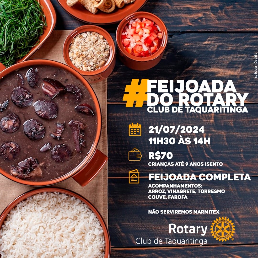O Rotary Clube de Taquaritinga estará promovendo no mês de julho, mais uma tradicional “Feijoada do Rotary”. O evento será realizado na sede do clube no domingo, dia 21 de julho, no horário do almoço, a partir das 11h30. Os ingressos já estão a venda por R$70 reais por pessoa, podendo ser encontrado com os companheiros do clube e com toda a diretoria.