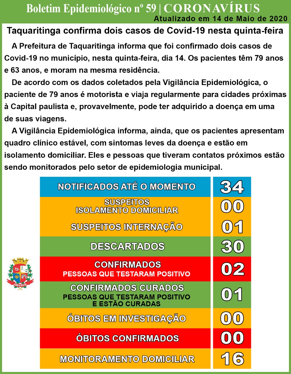 A Prefeitura Municipal de Taquaritinga (SP), através da Secretaria de Saúde, informa que dois casos de Covid-19 foram confirmados nesta quinta-feira (14). Os pacientes têm 63 e 79 anos e moram na mesma residência.