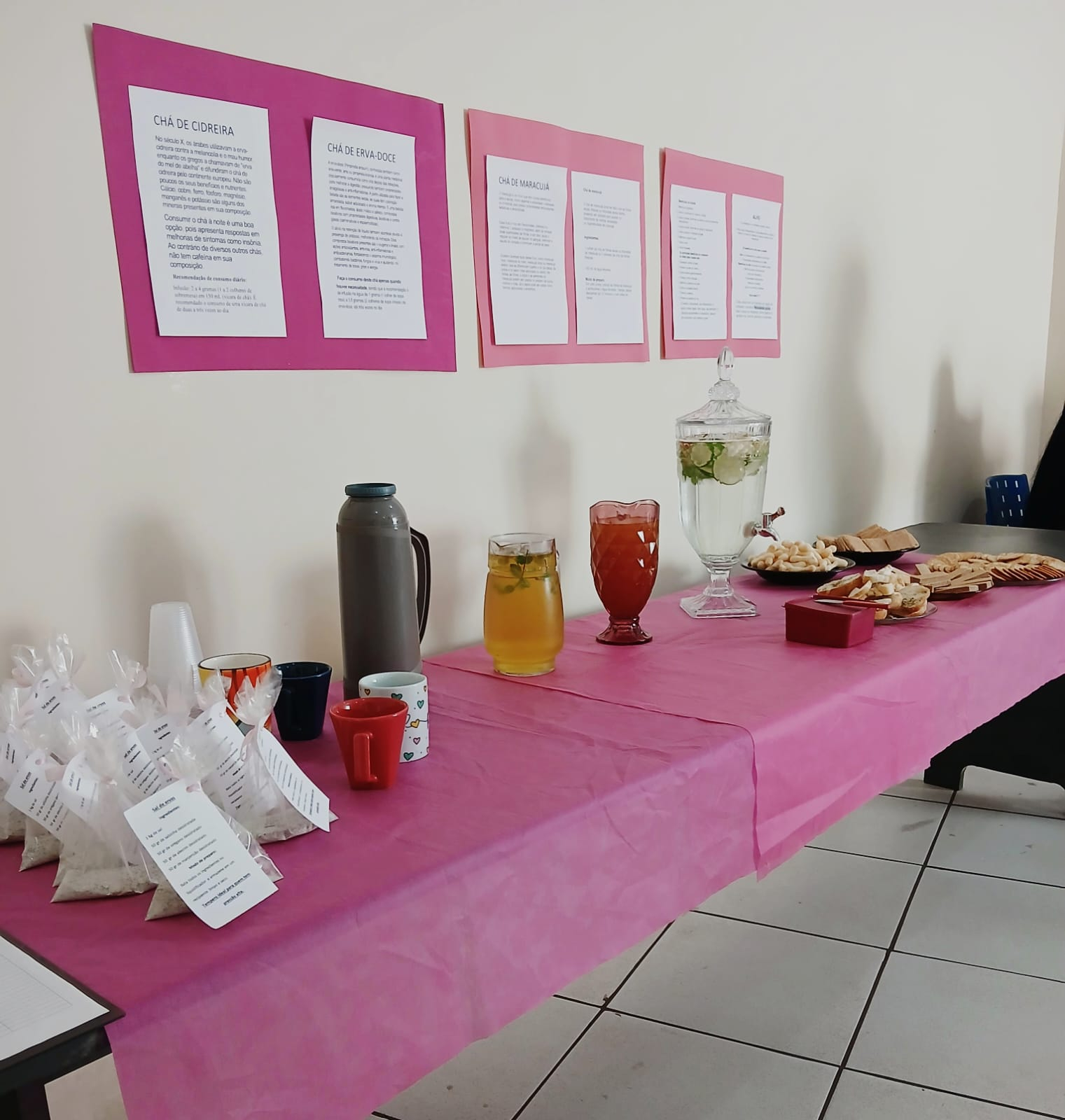 Os chás gelados disponíveis incluíam erva-doce com hortelã e limão, maracujá e maçã, enquanto os chás quentes oferecidos foram de cidreira e água saborizada. Cada um dos chás trazia propriedades especiais: a erva-doce, por exemplo, possui efeito calmante e fortalece o sistema imunológico; a hortelã auxilia na concentração e combate ao estresse e ansiedade; e o maracujá é conhecido por seus efeitos relaxantes, ajudando a aliviar a ansiedade. Essas ações reforçam o compromisso com o bem-estar físico e emocional das participantes.